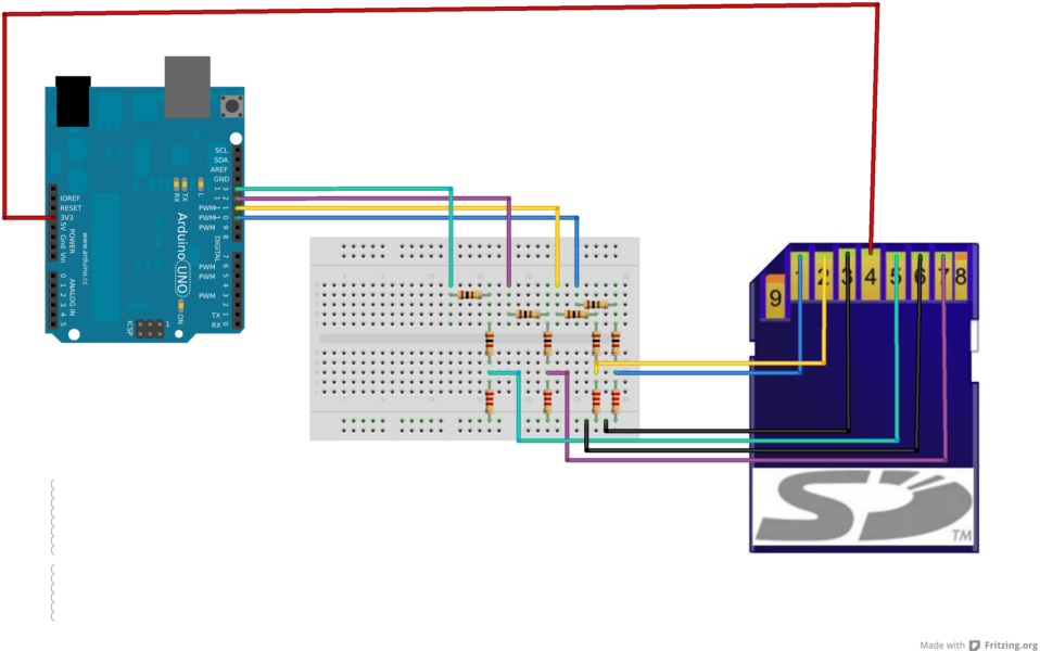 Unicamente necesitamos cuatro pines para poder comunicarnos con la tarjeta, y alimentarla a 3.3V: