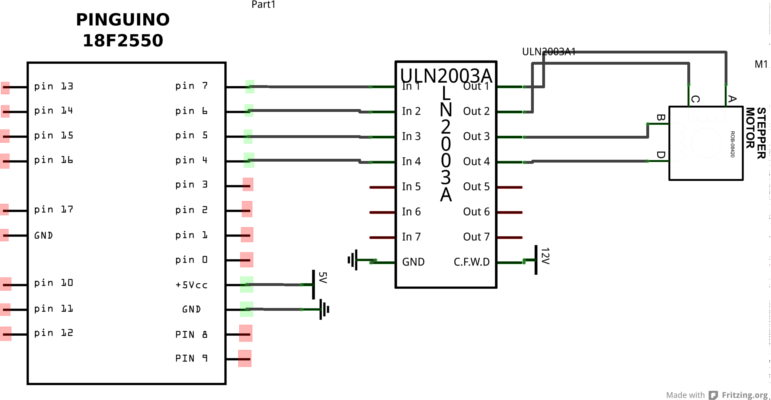 El circuito que necesitamos montar para controlar un motor PaP es muy simple, se basa en el driver ULN2003A y es rl siguiente:
