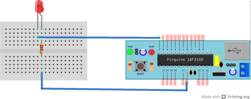 El circuito a controlar sería tan simple cómo la placa de Pinguino y un Led con su correspondiente resitencia: