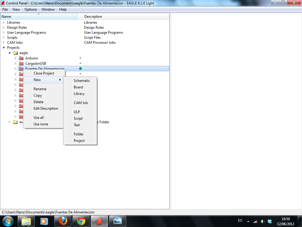 Nos colocamos con el ratón sobre la opción new y aparece un nuevo menú desplegable. Hacemos clic sobre Schematic